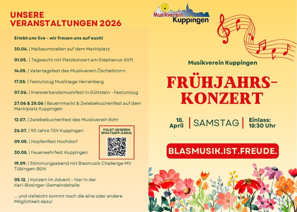 Der Musikverein lädt am Samstag, 18. April 2026 zum Frühjahrskonzert in die Gemeindehalle Kuppingen ein.